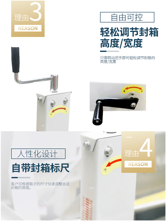VFC-50折蓋封箱機能對紙箱的上蓋進行自動折合,但紙箱大小變化時,需要人工調整梯形絲杠來調整封箱寬度和高度。紙箱上蓋自動折入,平穩順暢,封箱作業一氣呵成,美觀省力,可配合自動化包裝系統使用。 折蓋封箱機新型貼帶器,不用鼓風機吹挺膠帶,利用壓片裝置,使膠帶挺立不彎下而造成不能粘貼。上下升降使用進口剎車缸,定位準確。