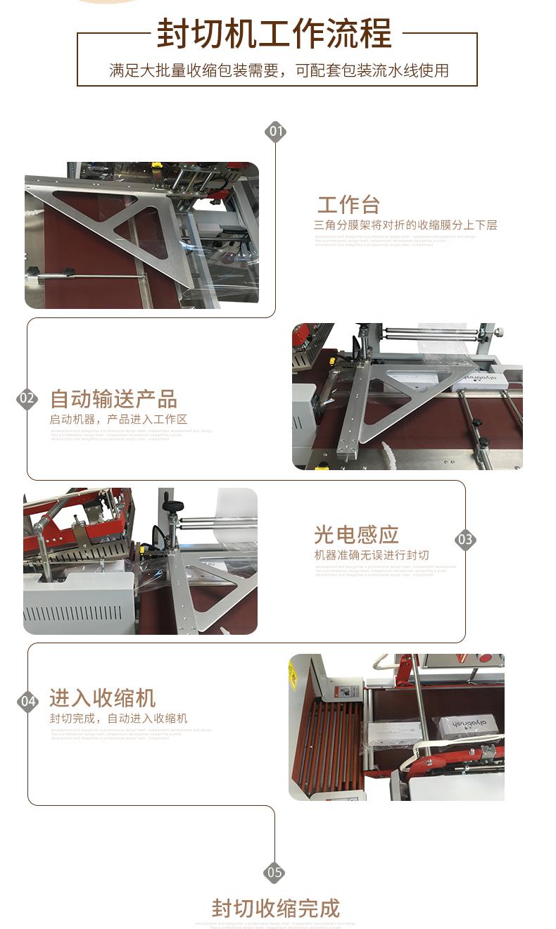 自動L型封切收縮包裝機是一款自動無人化操作的L型封切機,廣泛用于批量生產(chǎn)包裝的流水作業(yè),工作效率高,自動送膜打孔,自動套膜封切,只需手動調(diào)節(jié)導膜系統(tǒng)以及手動調(diào)節(jié)進料輸送平臺,適用不同寬度及高度的產(chǎn)品。